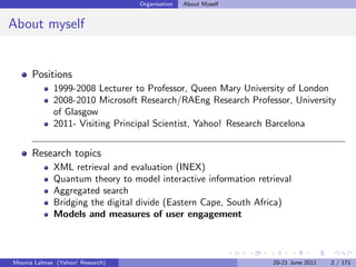 The document provides an introduction to information retrieval (IR), outlining various concepts, models, and terminology related to the field, including retrieval tasks and document representations. It discusses the evolution of IR, key terminology, and contrasts IR with information extraction and web search. The document also covers foundational techniques like indexing, retrieval models, and performance evaluation in IR systems.