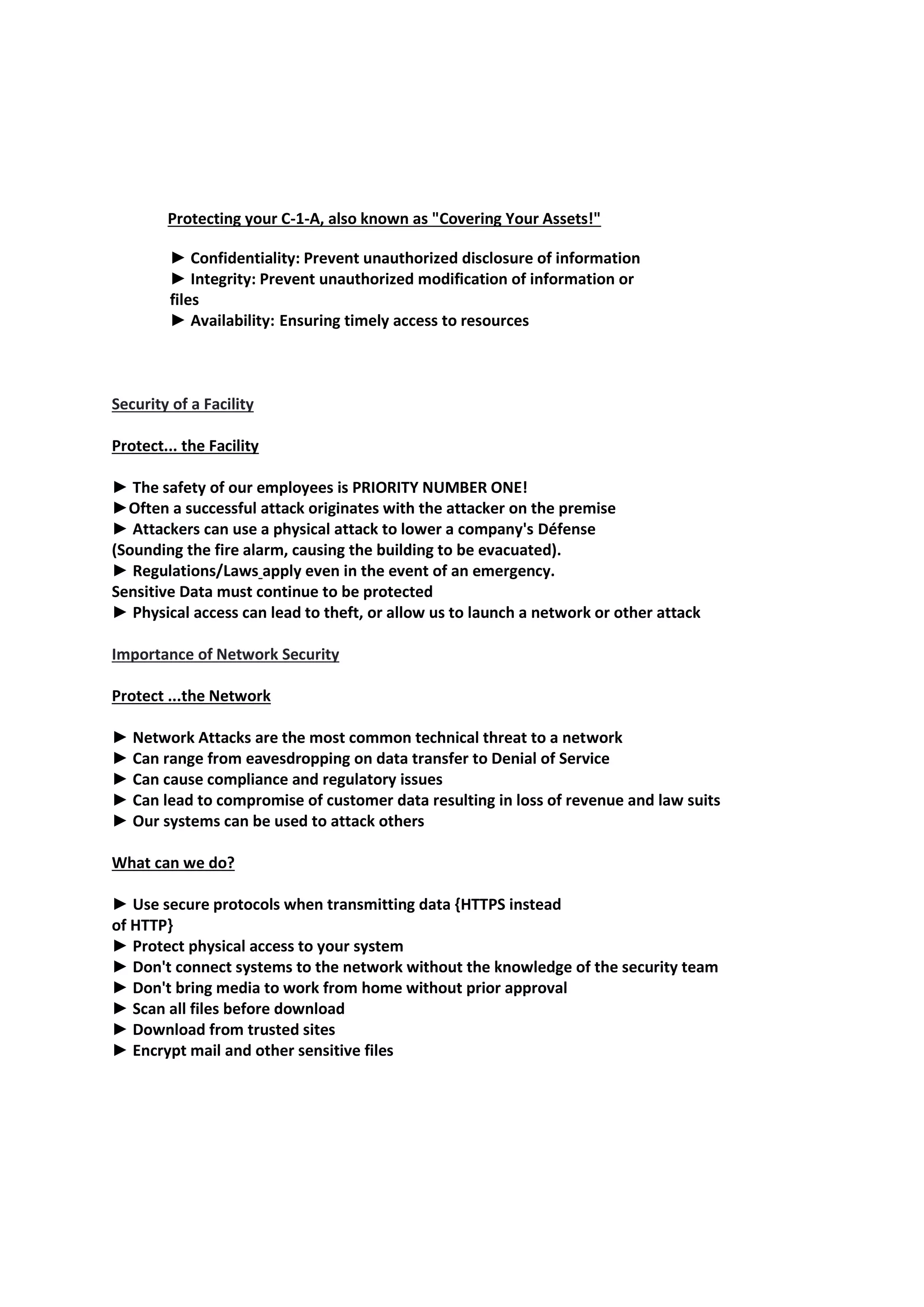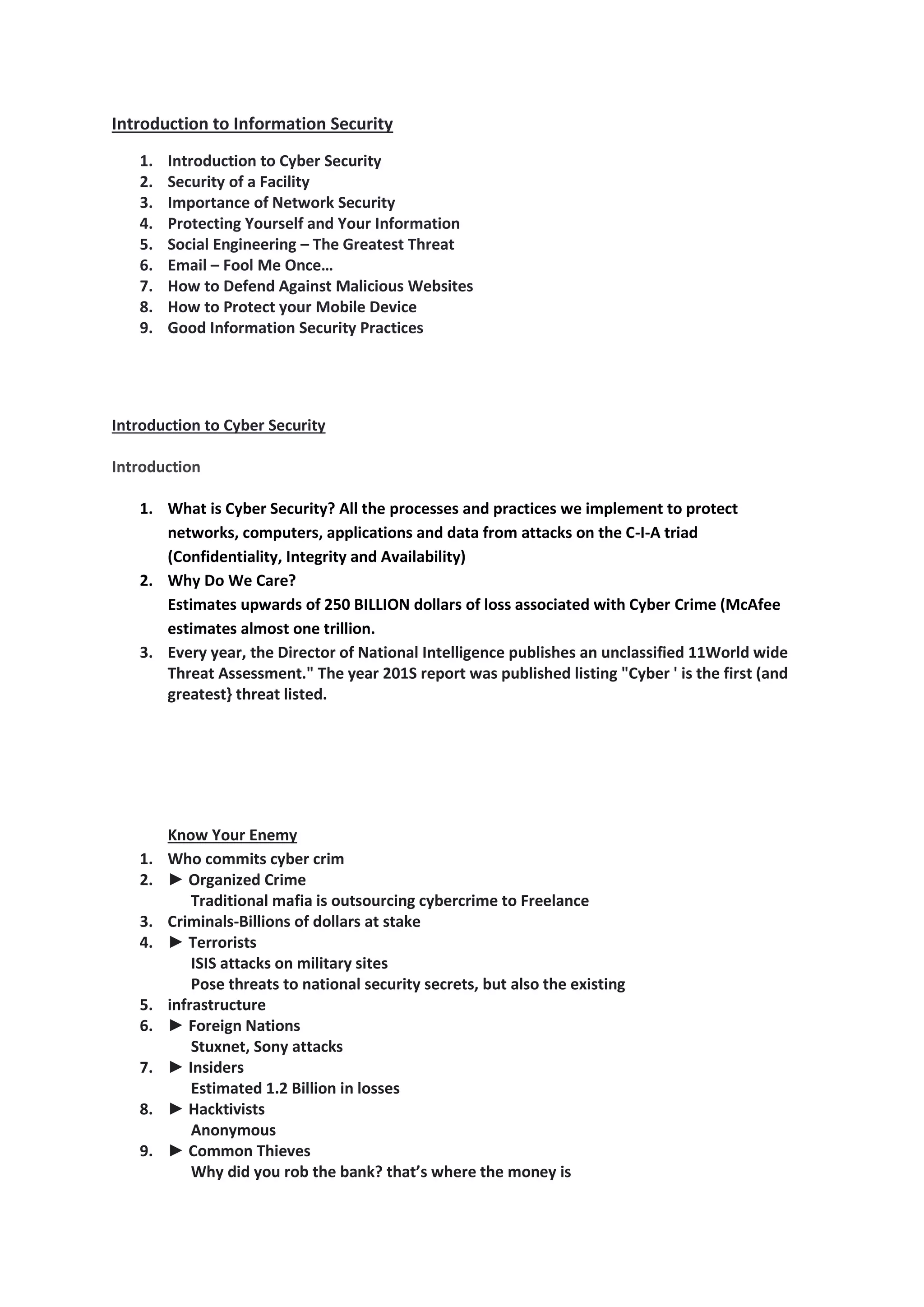The document provides an introduction to information security and cybersecurity. It discusses the importance of protecting the confidentiality, integrity and availability of data and systems. It outlines various cyber threats such as organized crime, terrorists, foreign nations, and insiders. It provides tips for securing facilities, networks, personal information, mobile devices and general security practices. These include using strong passwords, encryption, firewalls, being wary of social engineering and phishing attempts, and reporting any potential security incidents. The overall message is the importance of protecting assets from various cyber threats through technical and physical security measures.