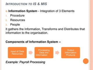 This document provides an introduction to information systems and management information systems (MIS). It defines key concepts such as data, information, and MIS. It then describes various types of information systems that support decision making, transaction processing, and executive functions. The document also discusses how MIS is used in different functional areas like production, human resources, finance, and marketing. It provides examples of the types of reports and analysis generated by MIS in each of these areas.