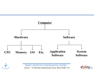 The document provides a comprehensive overview of computer hardware and software components, focusing on system architecture like CPUs, memory types (RAM, ROM), and secondary storage devices. It details secondary storage types, including magnetic tapes and disks, along with their characteristics, uses, and limitations. Additionally, it discusses magnetic tape technology as a backup medium, outlining its structure and examples.
