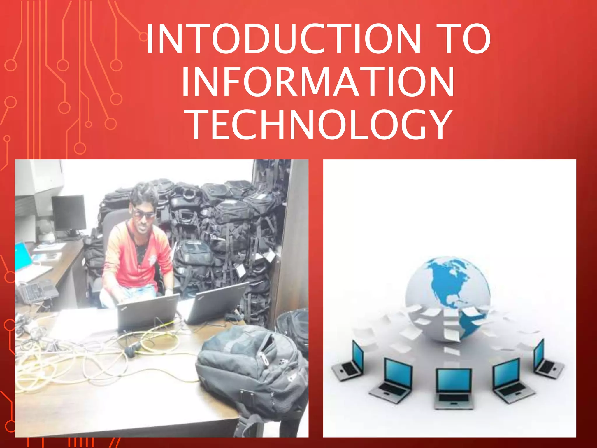 This document provides an introduction to key concepts in information technology including data, information, the need for information, qualities of information, value of information, data concepts, components of a file, data storage, file organization, information systems, computer-based information systems, and the interdependence between business organizations and information systems.