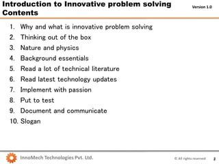 This document introduces innovative problem solving. It discusses thinking outside the box, understanding nature and physics, reading technical literature and updates, implementing ideas with passion, testing concepts, and documenting and communicating solutions. The overall goal is to decode the art of innovation by making connections between technologies and deriving new concepts that can solve problems and benefit society.