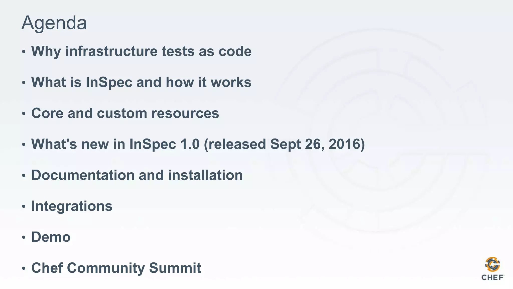 The document presents an overview of Inspec, an open-source framework for compliance and security testing, highlighting its new features in version 1.0 released on September 26, 2016. It discusses the importance of infrastructure tests as code, showcases various resource examples, and explains Inspec's execution through available commands. The document also mentions community profiles, custom resources, and installation options, emphasizing integration with Chef Automate and the use of Inspec shell for testing.