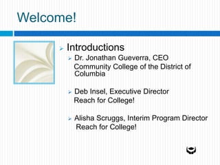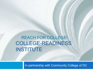 This document provides an overview of a college readiness institute organized as a partnership between the Community College of DC and Reach for College!, a nonprofit. The institute aims to inspire and provide strategies and materials to help students become college ready. Participants include high school and college representatives who will work together and share expertise to benefit students. The goals are to prepare students for college and careers, as 70% of DC jobs require postsecondary education, yet only 29% of local students go to college.