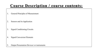 This document provides an overview of an introduction to instrumentation course, including its objectives, contents, and key concepts. The course aims to discuss measurement systems, sensors, signal conditioning circuits, conversion elements, and output devices. It covers general principles like accuracy, precision, sensitivity, and dynamic characteristics. Measurement systems have sensing elements, conditioning circuits, processing elements, and presentation outputs. Sensors convert non-electrical quantities into electrical signals based on physical principles like resistance, induction, thermoelectric effects, and more.