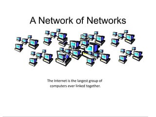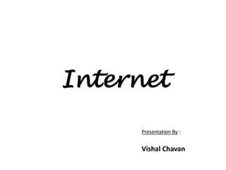 The document provides an overview of the internet including that it is a global network connecting millions of computers. It discusses that as of 2011, about 32.7% of the world's population, or 2.27 billion people, used the internet. The document also outlines some basic aspects of how the internet works including requirements like a computer, modem, phone line, and internet service provider to connect. It also lists some major services the internet provides such as the world wide web, email, social networking, education, news, and chat.