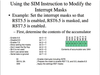 The document discusses interrupts in microprocessors. It defines an interrupt as an asynchronous signal from an I/O device that gets the processor's attention. Interrupts can be maskable, which can be delayed, or non-maskable, which cannot. The 8085 interrupt controller supports 5 interrupt lines, including one non-maskable TRAP line. Interrupts are handled through an interrupt vector table that redirects the processor to interrupt service routines.