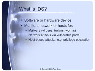 An intrusion detection system (IDS) monitors network traffic and system activities for malicious activities or policy violations. An IDS typically consists of sensors to generate security events, a central engine to correlate events and generate alerts, and a console for administrators to monitor alerts. There are different types of IDS, including network IDS that monitor network traffic, and host-based IDS that monitor activities on individual hosts. While firewalls block unwanted traffic using rules, IDS are needed to monitor for attacks hidden in acceptable traffic and help identify unwanted network traffic using signatures and anomaly detection. IDS can operate passively by detecting anomalies and logging or actively by performing actions like blocking traffic (intrusion prevention system).
