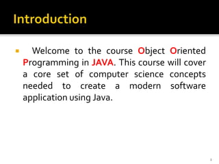 This document introduces an object oriented programming course in Java that will cover core computer science concepts needed to create software applications in Java. The course objectives are listed, including applying object oriented principles and programming with Java APIs, exceptions, files, threads, applets and swings. The document then provides an overview of Java, including its history, editions, key features such as being portable and object oriented, and differences from C/C++ languages.