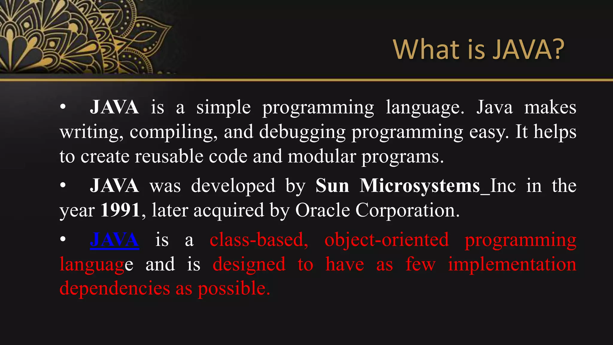 Java is an object-oriented programming language created in 1991 by James Gosling at Sun Microsystems. It was designed to be simple, secure, portable and have as few implementation dependencies as possible. Java's history began with a team at Sun Microsystems known as the Green team initiating development in 1991. Key features of Java include being object-oriented, platform independent, robust, portable, and high performance. The main difference between a Java application and applet is that an application runs independently without a browser while an applet is embedded in a web page and requires a Java-enabled browser.