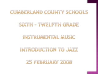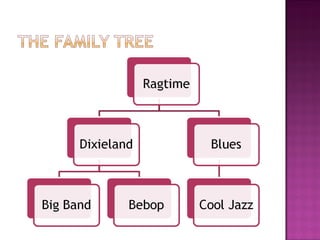 Jazz represents the merging of many musical traditions. It originated from the blending of African music brought by slaves and European music in the southern US. Dixieland jazz then developed in New Orleans in the early 1900s by combining blues, ragtime, brass bands, and other influences. Dixieland spread and gained popularity while different jazz styles like big band later emerged.