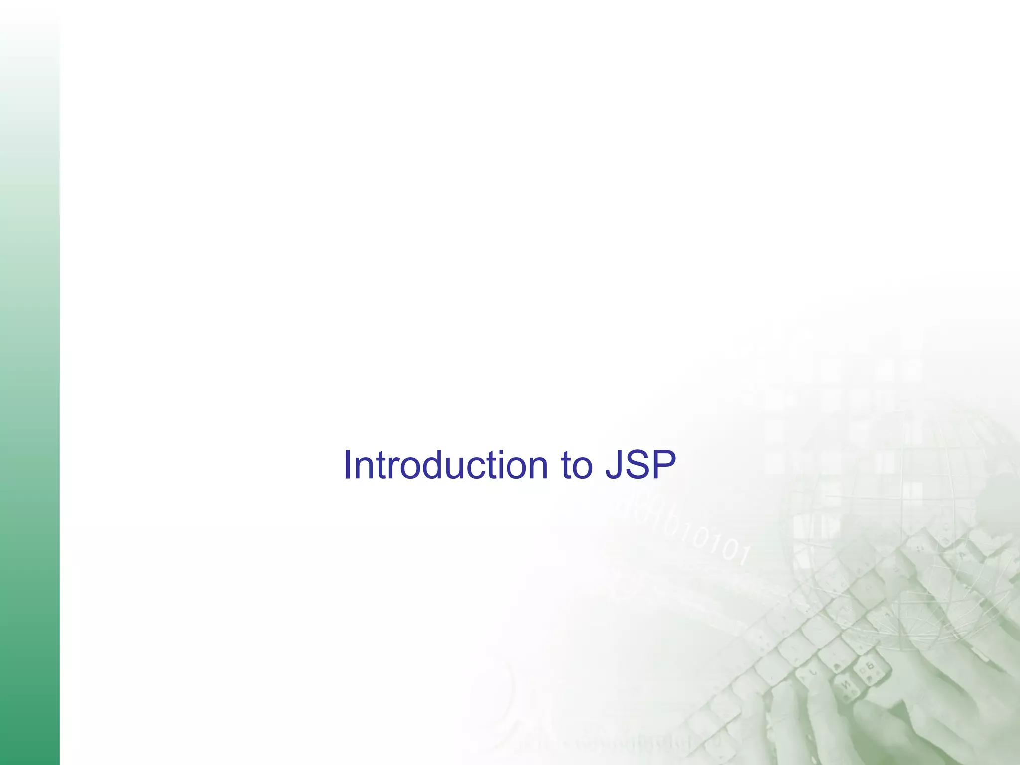 This document provides an introduction to Java Server Pages (JSP) including its advantages, elements, and lifecycle. JSP uses Java code to dynamically generate web page content while utilizing HTML for presentation. Key elements of a JSP page include static content, directives, expressions, scriptlets, and actions. The JSP lifecycle involves translation, compilation, and execution phases to generate servlets from JSP files and handle requests.