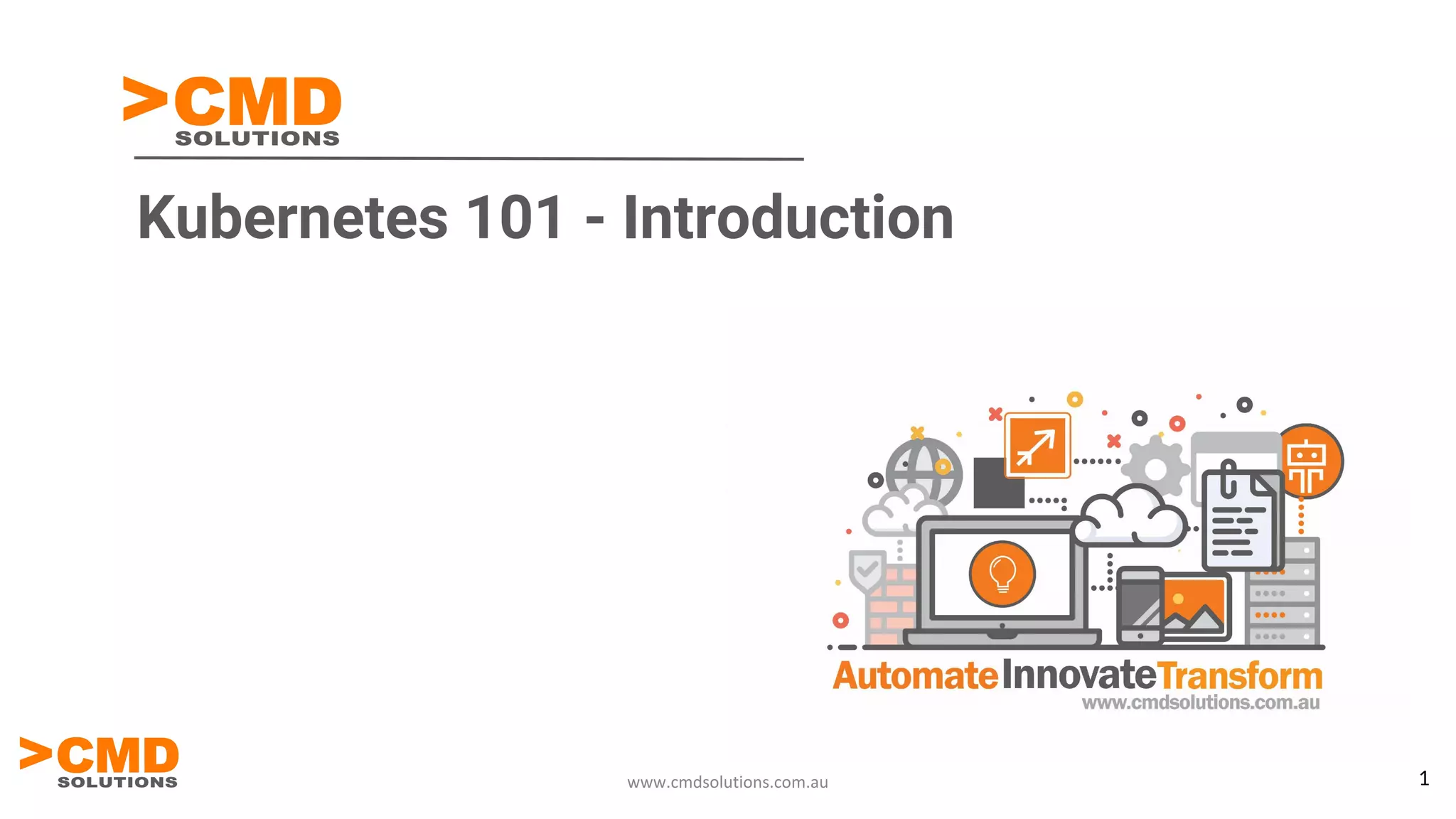 The document provides an overview of CMD Solutions, a consulting company focused on cloud-native applications, DevOps, and Kubernetes. It explains the significance of Kubernetes as an open-source system for automating deployment, scaling, and management of containerized applications, along with its terminology and key concepts like pods and services. Additionally, it outlines the company's roadmap for Kubernetes education and highlights its commitment to helping clients transform through automation and security integration.