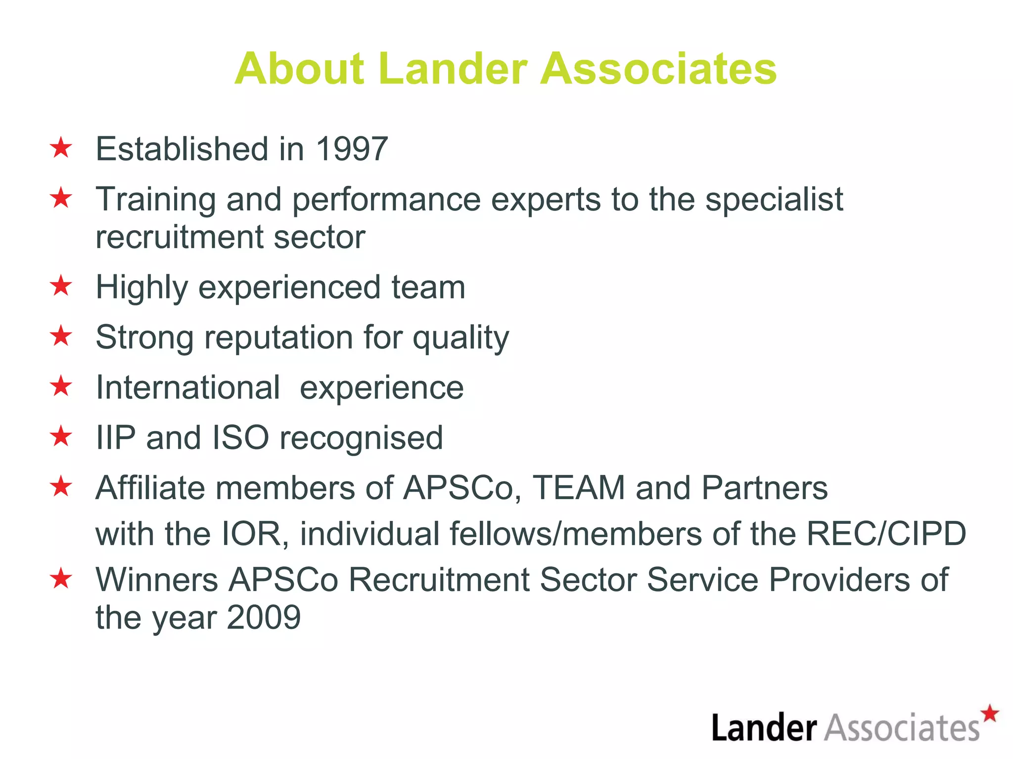 Lander Associates, established in 1997, specializes in training and performance for the recruitment sector, boasting a highly experienced team and strong international recognition. They offer a bite-sized training series in recruitment and leadership, along with accredited management certificates. The company is recognized for quality and has received awards in the recruitment sector.