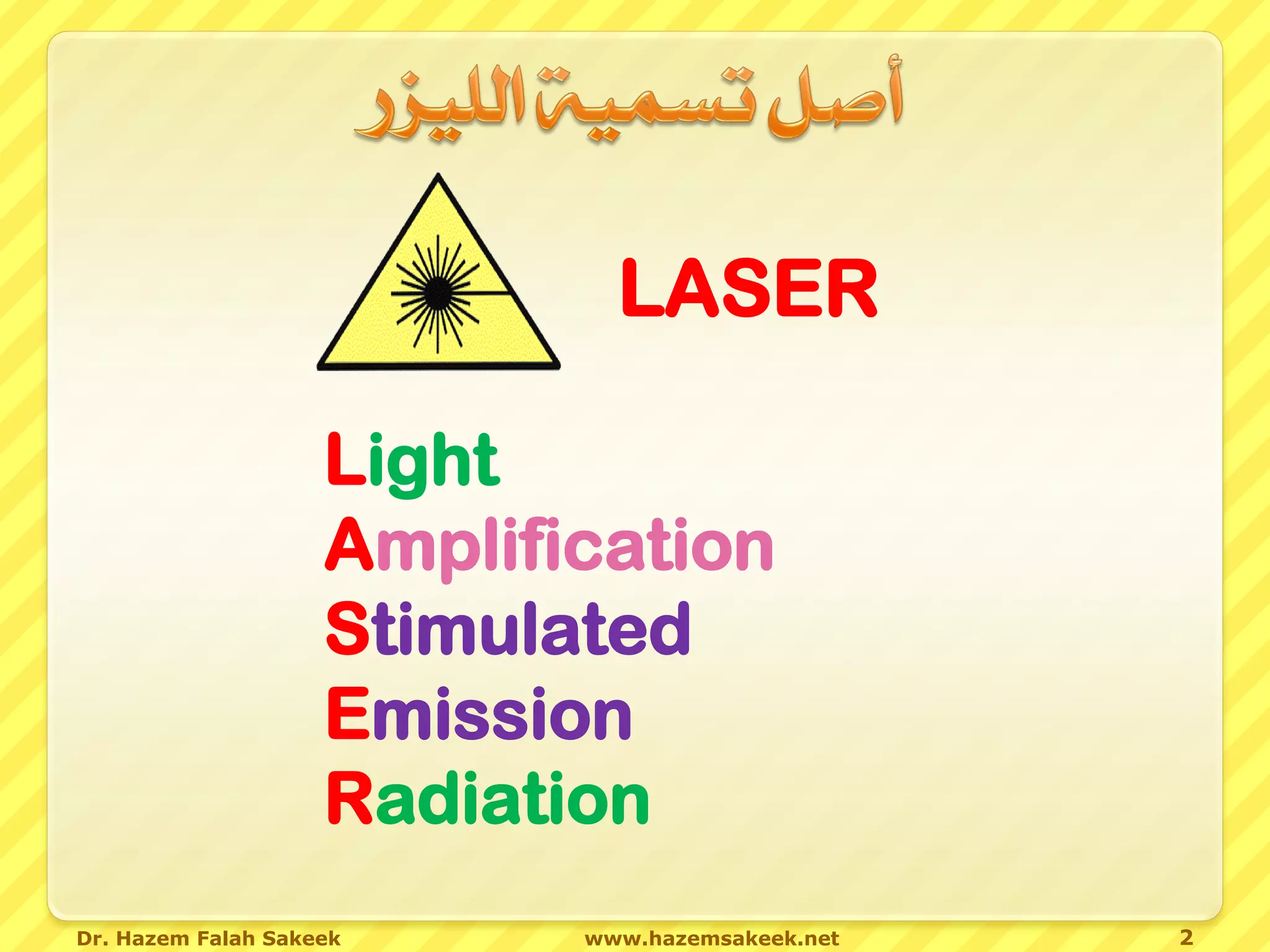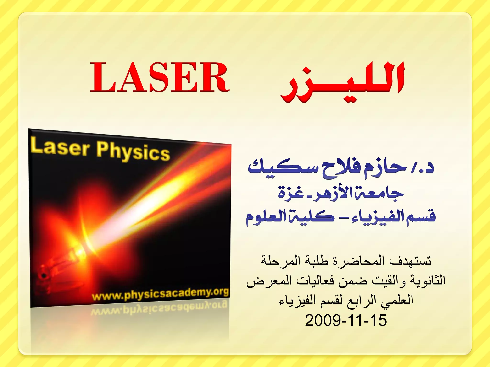 تتناول المحاضرة خصائص الليزر وتطبيقاته، حيث يُعتبر الليزر مصدر ضوء خاص يمتاز بكونه أحادي اللون، اتجاهي، ومترابط. تم التنبؤ بوجود الليزر من قبل ألبرت اينشتاين، وصُمم أول جهاز ليزر بواسطة T.H. Maiman باستخدام الياقوت. تشمل التطبيقات الحالية لليزر تفتيت الحصوات وتحسين تقنيات التصوير.