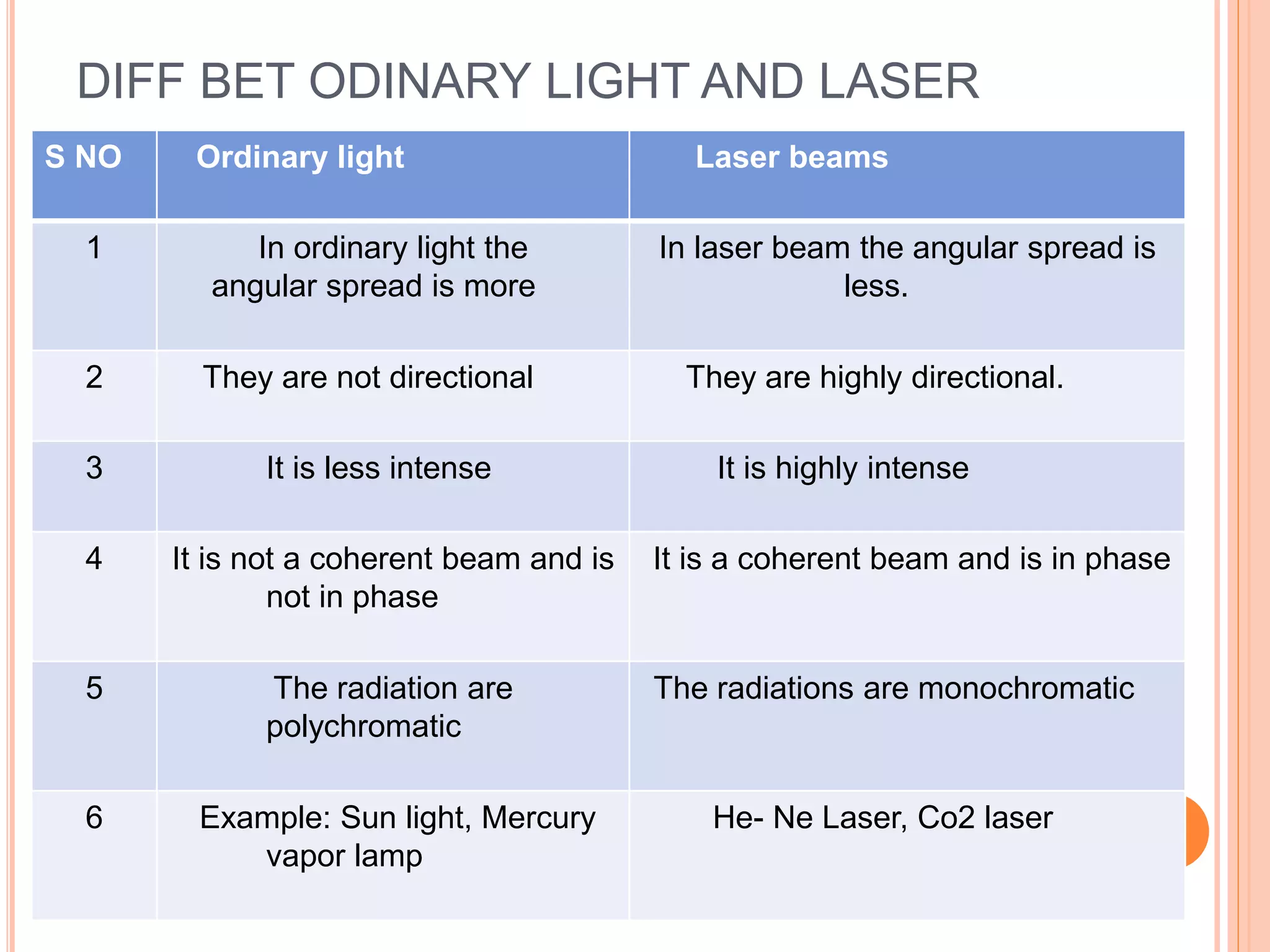 Laser stands for "Light Amplification by Stimulated Emission of Radiation." Lasers emit a powerful, monochromatic, collimated beam of light that is coherent in nature. Lasers have several key characteristics that distinguish them from ordinary light sources: (1) They are highly directional with an angular spread of 1mm/m compared to 1m/m for ordinary light; (2) They have high intensity due to their directionality focusing the beam; and (3) They are highly monochromatic and coherent, with wave trains of the same frequency that are in phase. The first working laser was demonstrated in 1960 by Dr. Theodore Maiman using a ruby crystal.