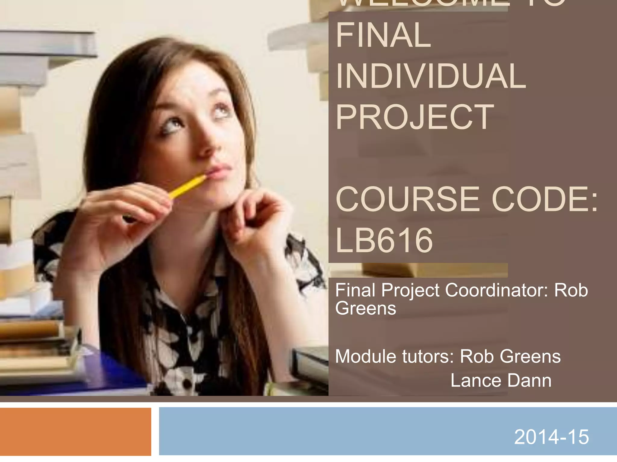 This document provides information for students on their final individual project course. It is a 40-credit module that takes place over two semesters and is an important part of their degree classification. Students will conduct in-depth research on a topic of their choice under the supervision of academic staff. They must complete a presentation, practical project, and research report that are interlinked and relate to the same topic. The document outlines the learning outcomes, assignment deadlines, available supervisors and their research interests, supervision meeting formats, and other course requirements.