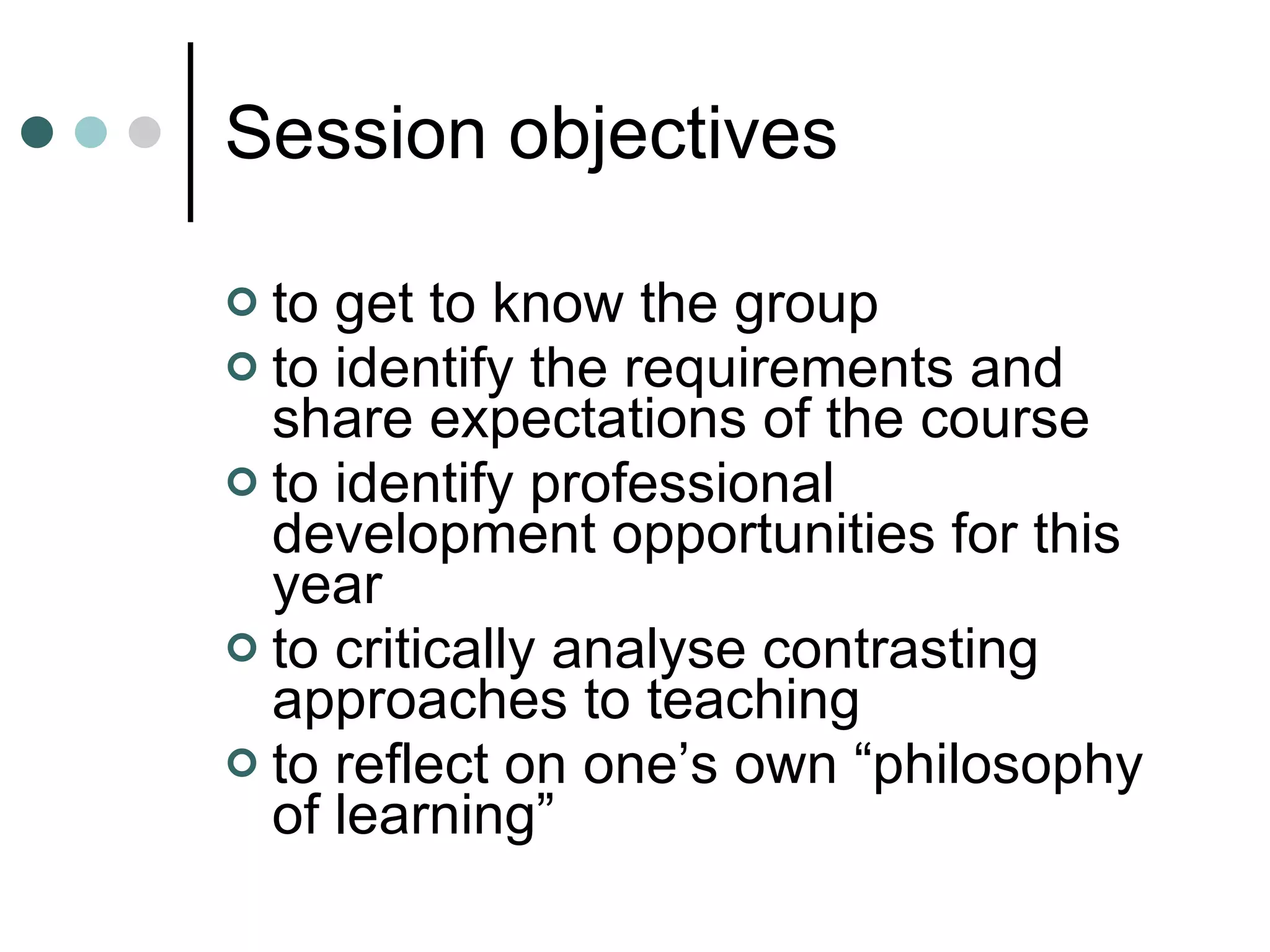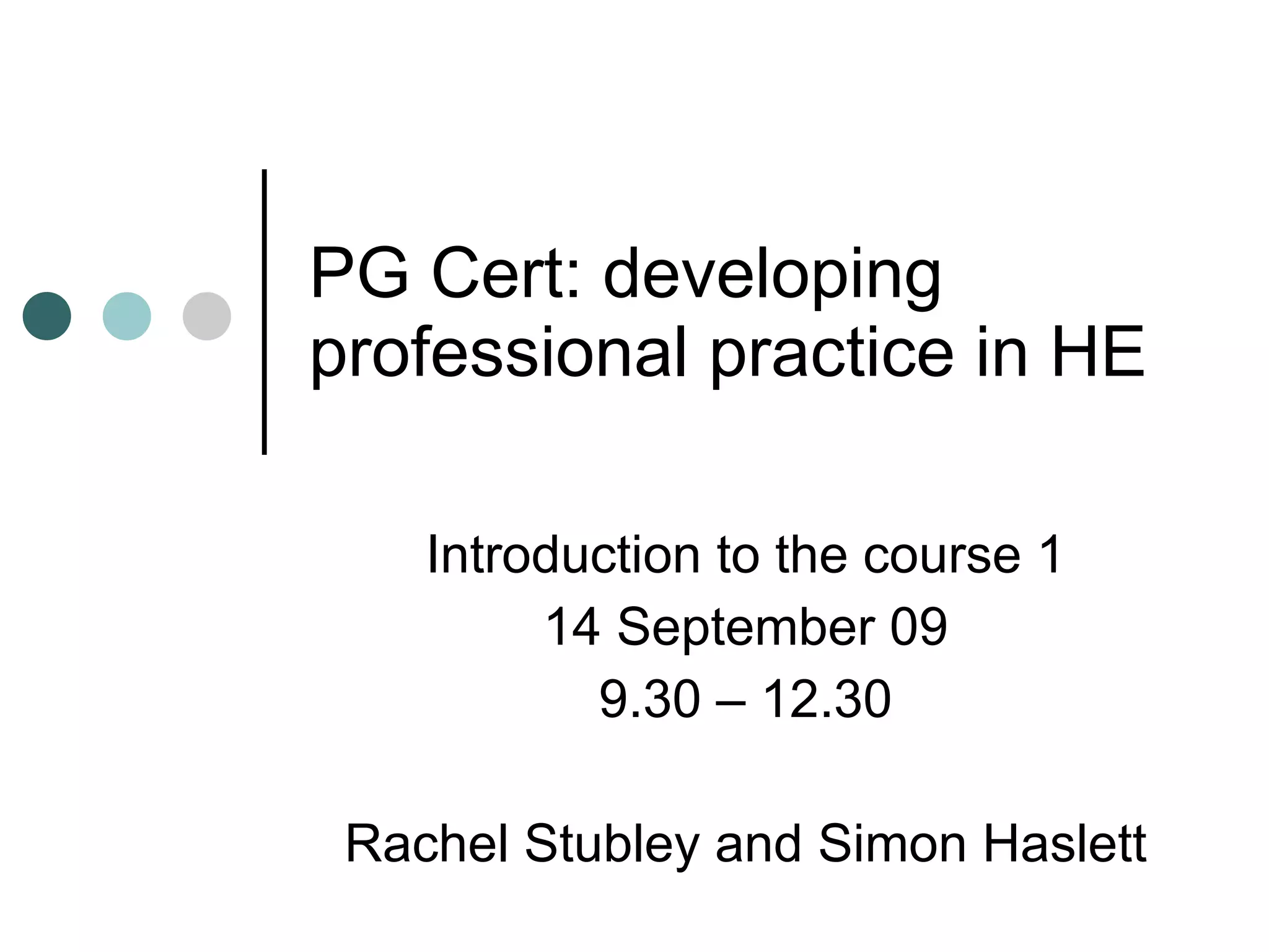This document provides an overview of the objectives and content covered in the PG Cert: developing professional practice in HE Introduction to the course. It discusses introducing participants, identifying requirements and expectations of the course, analyzing approaches to teaching, and reflecting on one's philosophy of learning. It also outlines the assessment components and programme for the year. Additionally, it introduces the Centre for Excellence in Learning and Teaching (CELT) at Newport, including its professional development programmes, conferences, journal, and awards for teaching excellence. Participants are asked to discuss their hopes and concerns for the course and consider strengths and limitations of different approaches to learning.