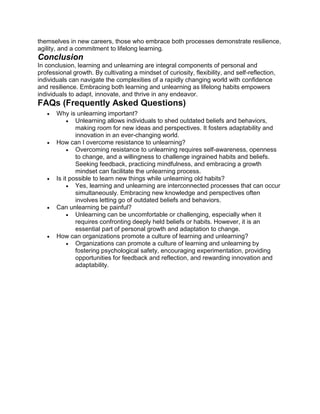 The document discusses the concepts of learning and unlearning. Learning involves acquiring new knowledge or skills, while unlearning requires letting go of outdated beliefs or behaviors. Both are essential for adapting to changing environments. Continuous learning is important for professional and personal development, allowing individuals to stay relevant. Unlearning challenges existing assumptions and habits that no longer apply. It can be difficult due to emotional attachments and ingrained patterns, but strategies like mindfulness and feedback can help with the process. Embracing both learning and unlearning supports lifelong growth and thriving in a changing world.