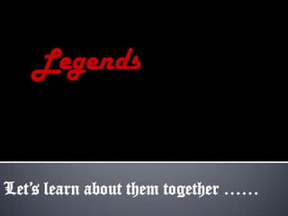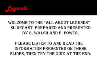 This slidecast presentation defines and provides information about legends. It explains that legends are semi-true stories passed down orally from person to person that have important cultural meaning. Legends usually include some factual elements and are based on historic events, but also contain fantastical elements. They often feature heroic characters or locations and may incorporate a culture's spiritual beliefs. The presentation concludes by directing viewers to a quiz and website with more legends.
