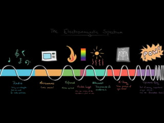 Light is a type of electromagnetic radiation that behaves as both a particle and wave. It comes in packets called photons that act like particles. As a wave, light has frequencies and wavelengths. The frequency is the number of times the wave passes a fixed point per unit of time, and higher frequencies correspond to shorter wavelengths. Different frequencies and wavelengths of light carry different amounts of energy. The electromagnetic spectrum classifies light based on its energy, with some types like ultraviolet and infrared having wavelengths just outside the visible light range that the human eye can see. Visible light corresponds to wavelengths from 400-700 nanometers and is experienced as the colors violet, blue, green, yellow, orange, and red from shortest to longest wavelength.