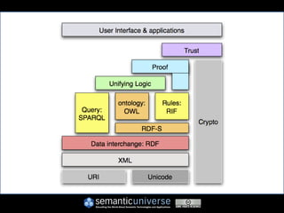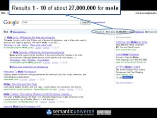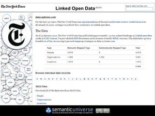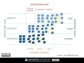 The document introduces the concept of the Semantic Web and Linked Data, emphasizing their roles in connecting and meaningfully organizing information on the internet. It discusses various semantic technologies, their functionality, and uses, as well as the importance of using shared vocabularies and structured data formats like RDF and SPARQL. Additionally, it highlights real-world applications, challenges, and the growing need for data scientists in the context of vast data production.