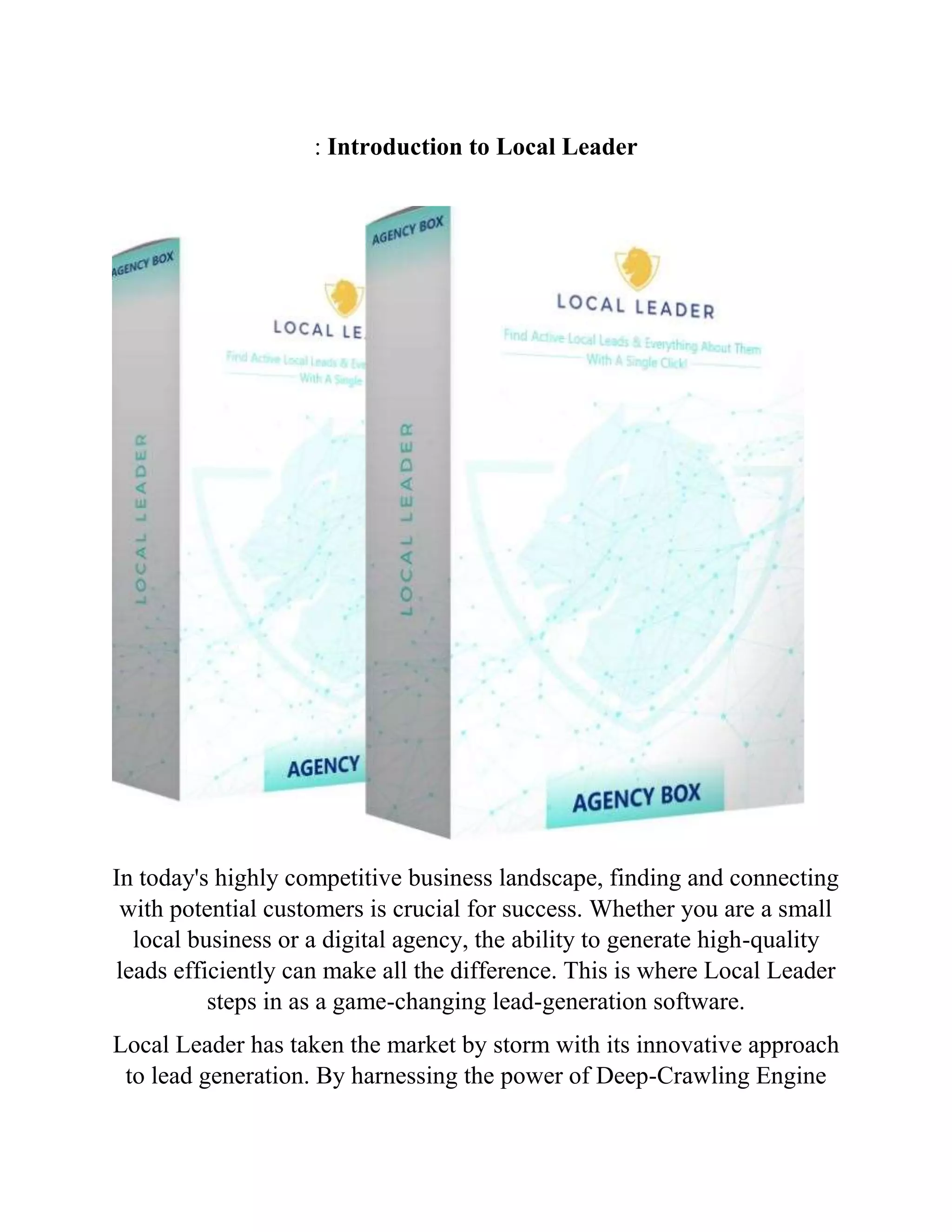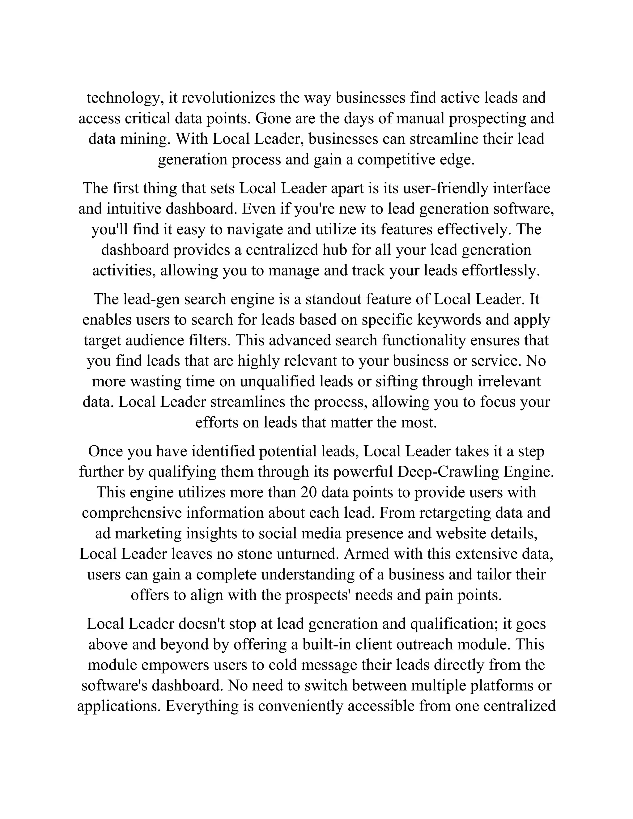 Local Leader is an innovative lead-generation software designed to help businesses efficiently find, qualify, and engage with potential leads using a deep-crawling engine that provides extensive data points. Featuring a user-friendly interface, built-in email sending tools, and a powerful outreach tracker, Local Leader empowers businesses to streamline their lead generation and outreach processes. With affordable pricing and a comprehensive range of features, it offers significant value to marketers and business owners seeking to enhance their client acquisition strategies.