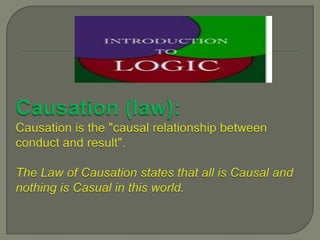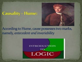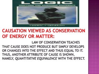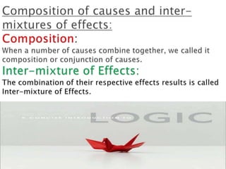 Aristotle viewed causes as having four factors - material, formal, efficient, and final. The material and formal causes are intrinsic, while the efficient and final causes are extrinsic. Later philosophers like Mill defined cause as the sum of invariable antecedents. The view of causation has passed through three stages - the popular stage focused on dominant causes, the scientific stage distinguished between causes and mere coexistence, and the speculative stage viewed both causes and effects as complex. Causes can combine in mechanical or chemical ways, producing homogeneous or heterogeneous effects. Cause and effect also often interact in a relationship of mutuality.