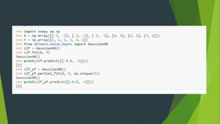 This document provides an introduction to machine learning, including definitions, key concepts, and algorithms. It defines machine learning as giving computers the ability to learn without being explicitly programmed. It distinguishes machine learning from artificial intelligence and describes supervised and unsupervised learning. Popular machine learning algorithms like naive Bayes, support vector machines, and decision trees are introduced. Python libraries for machine learning like scikit-learn are also mentioned.