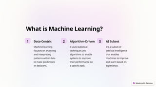 programmed. It involves algorithms that parse data, learn from it, and