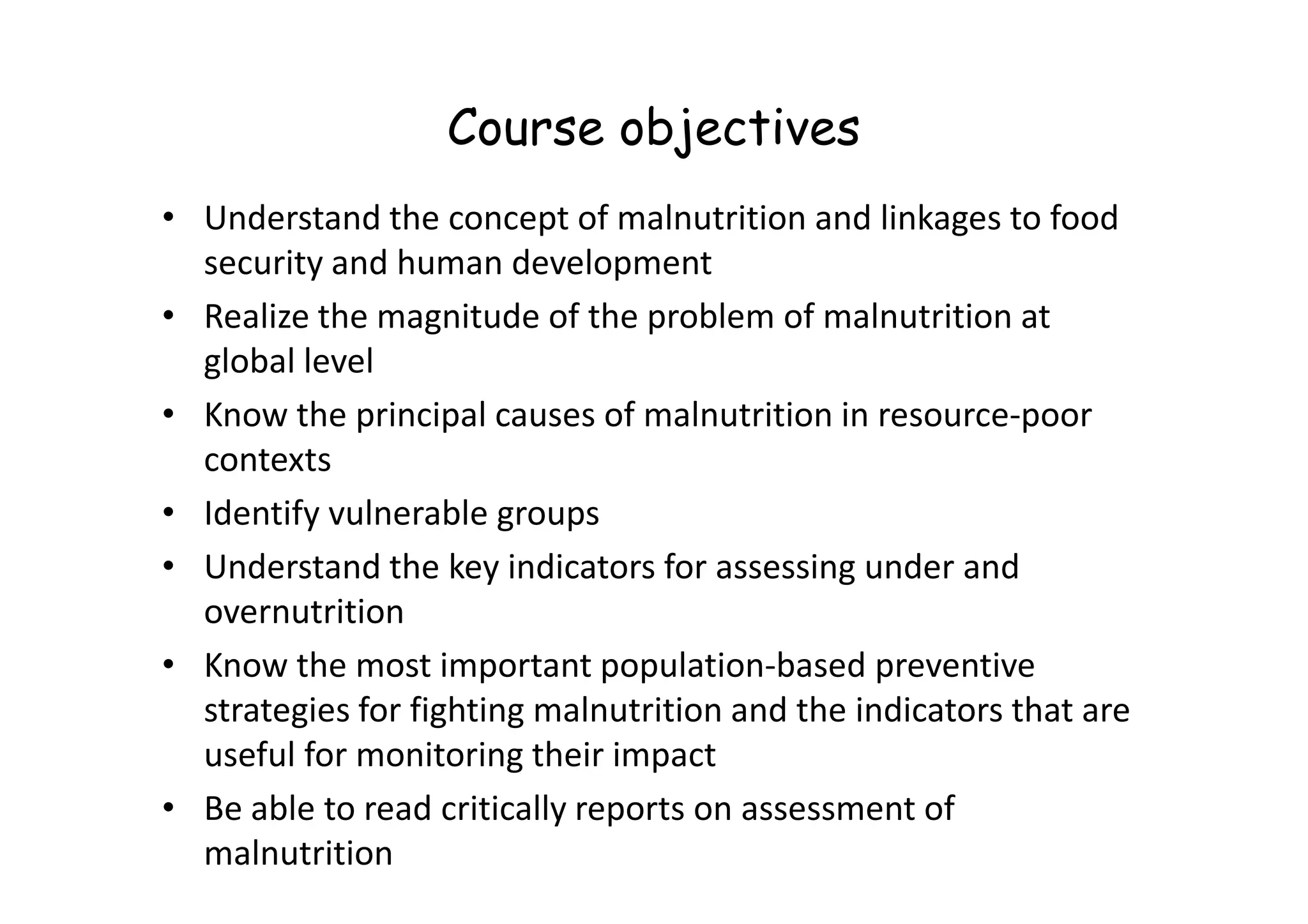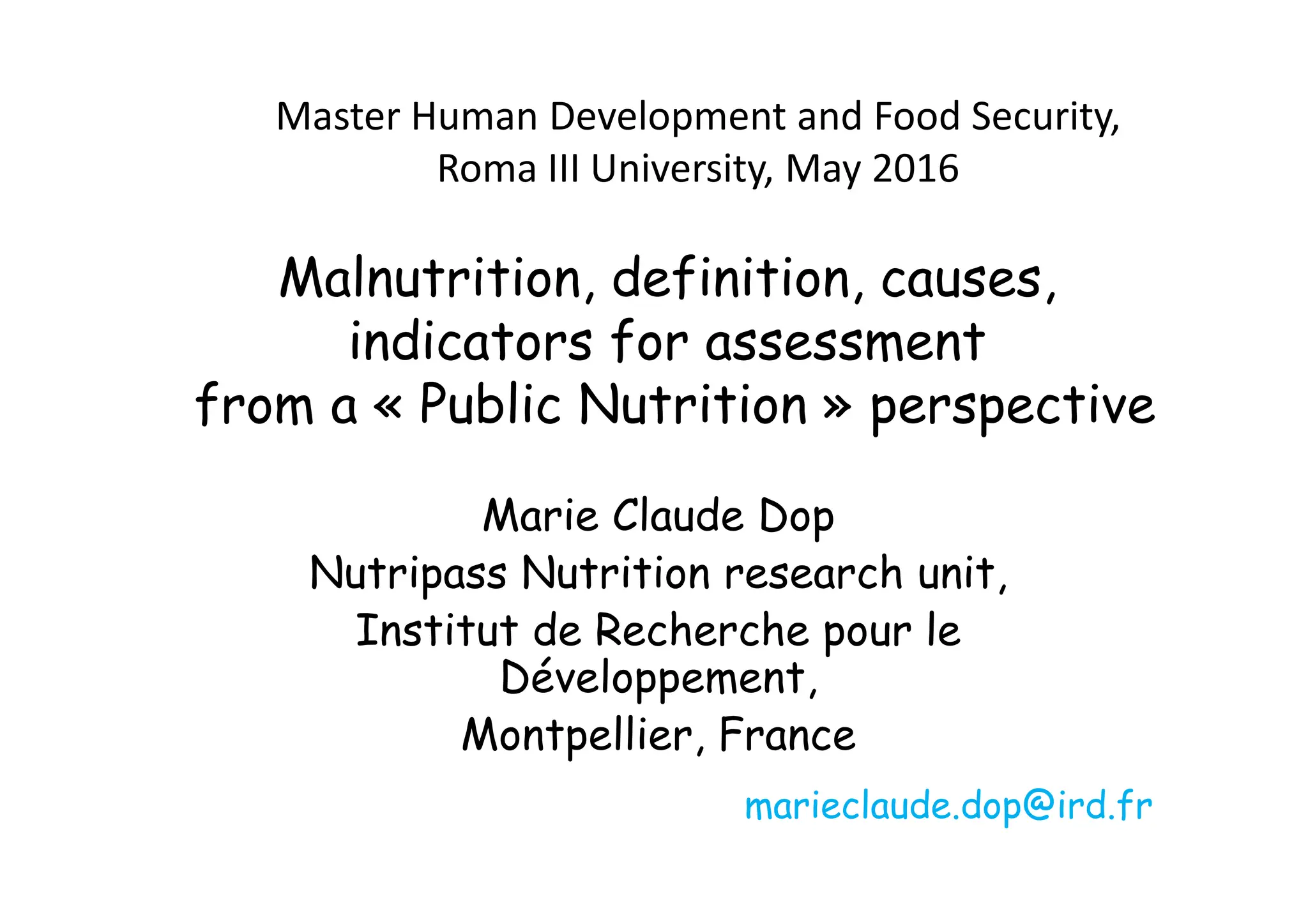 The document discusses malnutrition from a public nutrition perspective, outlining its definition, causes, and assessment indicators. It emphasizes the importance of nutrition in relation to food security and human development, the prevalence of malnutrition globally, and the need for effective monitoring and preventive strategies. Key parts include different types of malnutrition, assessment methods, and the connection between undernutrition and child mortality.