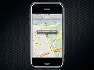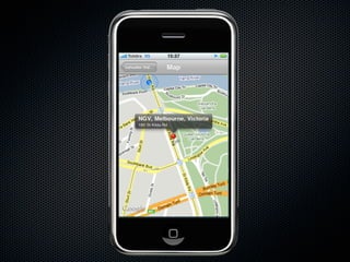The document provides an introduction to using MapKit in iPhone applications, explaining the process of adding maps, managing annotations, and utilizing geocoding functionalities. It outlines steps for setting map positions, displaying user locations, and creating custom annotation views. Additionally, it references resources for further learning about MapKit integration and usage.