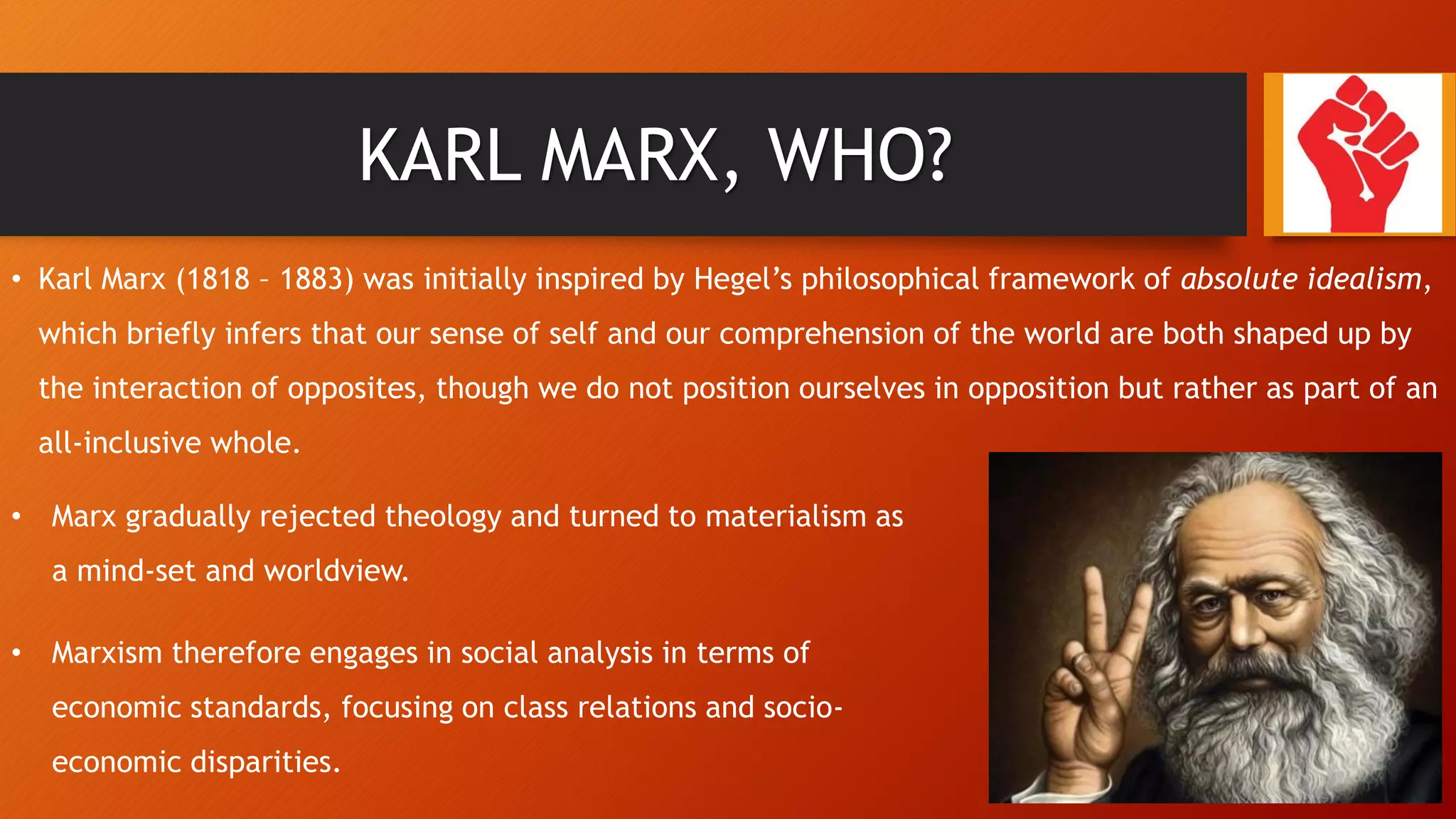 Karl Marx was initially inspired by Hegel's philosophy but later rejected theology in favor of materialism. Marxism views society and history through the lens of economic classes and their conflicts. Marx and Engels believed capitalism would inevitably give way to socialism and then communism, with a stateless, classless society. George Orwell's novel Nineteen Eighty-Four depicts a dystopian future that shows the negative outcomes Marx predicted could result from unchecked capitalism, such as a society divided into distinct social classes and total control by the ruling class. The novel is an example of how Marxism can be applied to literary analysis by viewing the work through the lens of class struggles and conflicts between the proletariat and bourgeoisie.