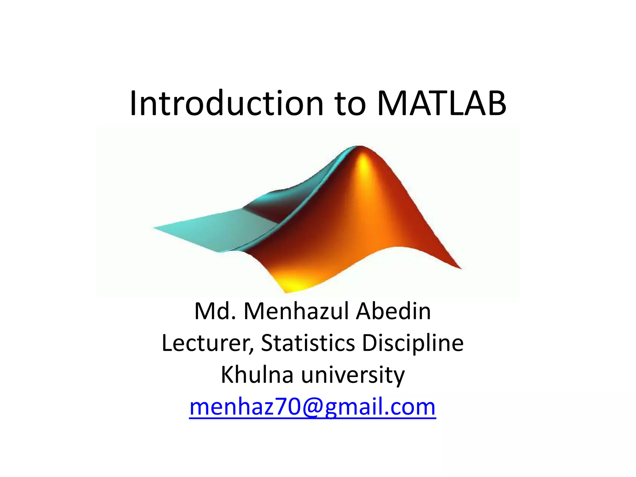 This document provides an introduction to MATLAB. It discusses that MATLAB is a high-level language for technical computing where everything is a matrix and it is easy to perform linear algebra. It describes the MATLAB desktop interface and valid variable names. It also summarizes how to perform basic operations like addition, subtraction, multiplication, etc. on matrices and vectors. Finally, it outlines various matrix operations, statistical functions, random number generation, and plotting in MATLAB.