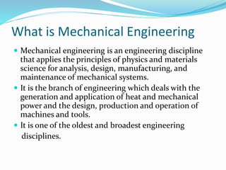 Mechanical engineering applies physics and materials science for the design, manufacturing, and maintenance of mechanical systems, making it a fundamental and broad engineering discipline. It involves various roles in industries, focusing on the design, development, construction, and operation of machinery, with a strong emphasis on individual attention for students and career opportunities across multiple sectors. Mechanical engineers require a solid background in math and science, and the field is characterized by ongoing demand and diverse applications.