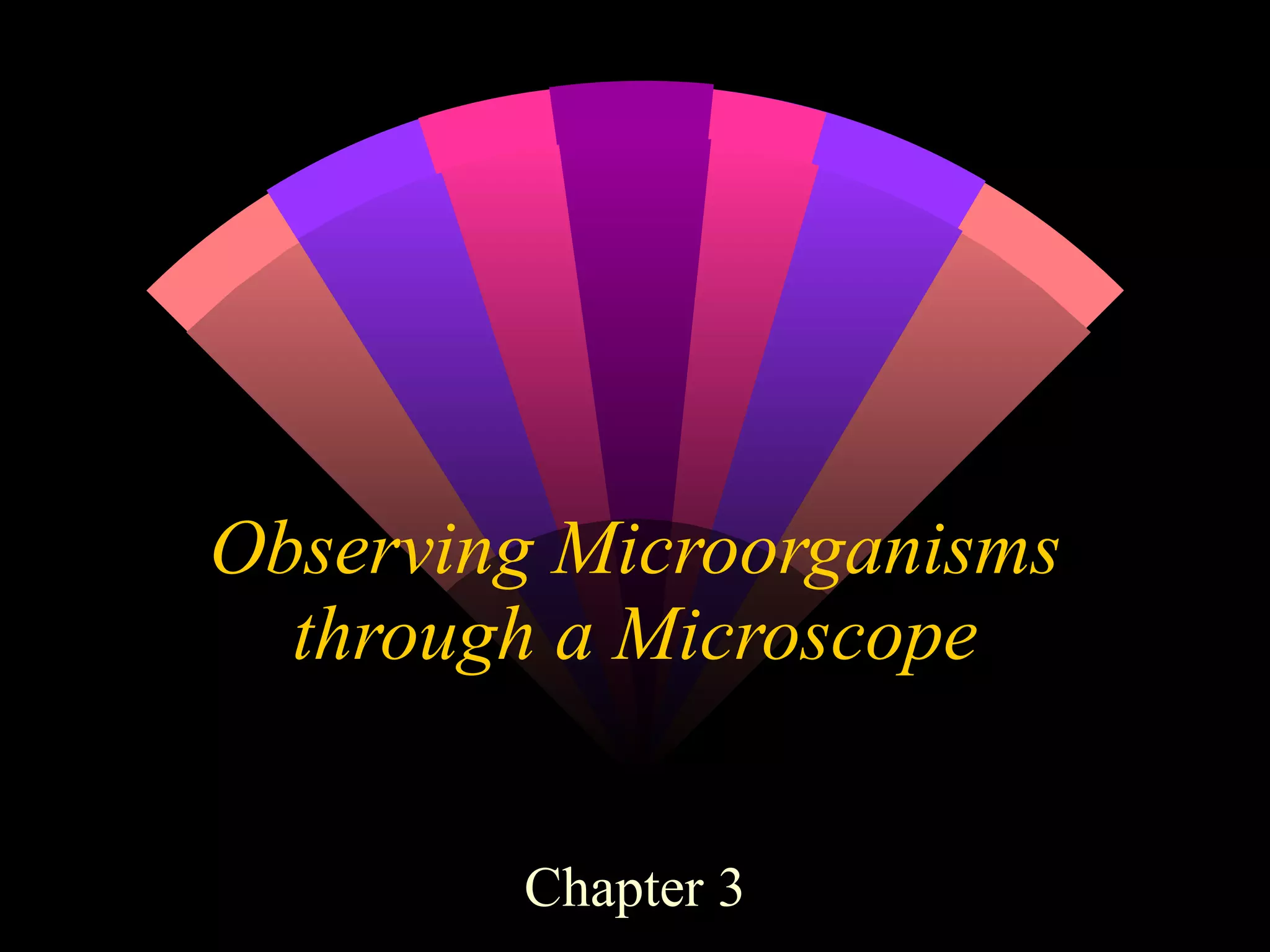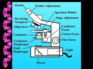 1. The document discusses different microscopic techniques used to observe microorganisms, including growing and isolating bacteria, observing them under brightfield and phase contrast microscopes, and staining them using techniques like Gram staining and acid-fast staining. 2. It explains the basic parts and functions of a light microscope like the objective lenses, condenser, diaphragm, and describes different types of microscopes and maximum magnifications. 3. Special staining techniques are described that allow visualization of specific structures like capsules, flagella, endospores using stains like India ink, malachite green, and the five basic groups of microorganisms are identified.
