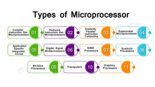 A microprocessor is an integrated circuit that functions as the central processing unit of a computer, executing instructions and performing calculations. The document outlines the evolution of microprocessors, detailing key milestones and the fetch-decode-execute cycle, as well as the architectural differences between von Neumann and Harvard architectures. Applications of microprocessors include personal computing devices, embedded systems, and various consumer electronics.