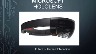 Microsoft HoloLens is an augmented reality headset that allows users to interact with holograms overlaid in the real world. It uses advanced sensors and an optical projection system to generate multi-dimensional holograms with low latency. A custom processing unit analyzes sensor data in real time to understand gestures and the environment. HoloLens has transparent lenses, adjustable fit, and integrated speakers for an immersive experience without cords or phones. While it enables new forms of collaboration and productivity, HoloLens has limitations including very high cost, limited availability, lack of service centers, and high bandwidth usage.
