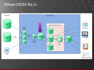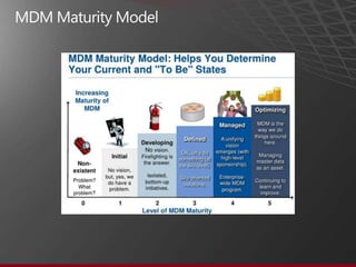 The document presents an overview of Master Data Management (MDM) highlighting its necessity, benefits, and various scenarios for implementation. It emphasizes the importance of MDM in reducing duplicate data, improving decision-making and compliance, and facilitating efficient data stewardship. Additionally, it discusses Microsoft Data Services (MDS) and the integration capabilities with business user needs through tools like Excel add-in.