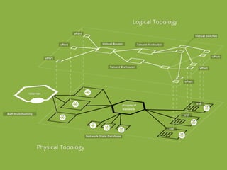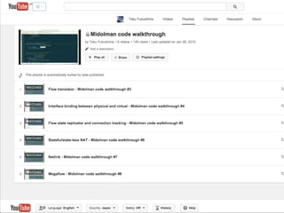 MidoNet is an open source network operating system that provides software-defined networking and network virtualization capabilities. It features distributed logical switching, routing, firewalling, load balancing and tunneling using protocols like GRE and VXLAN. MidoNet integrates with OpenStack Neutron and has a REST API for configuration and management. It uses a distributed architecture with agents on each host controlling the Open vSwitch datapath and communicating with a central database for topology and configuration information. The MidoNet community is active on Slack, mailing lists, code reviews and documentation to support the project.