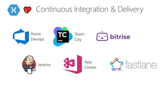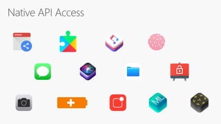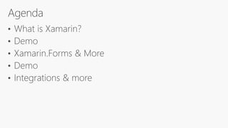 The document introduces Xamarin, an open-source app platform by Microsoft for building modern applications on various operating systems using .NET. It emphasizes the benefits of code reuse and native performance, highlighting Xamarin Essentials and Xamarin Forms for cross-platform app development. Additionally, it outlines integrations with Azure services and the tools available for developers to enhance their app-building experience.
