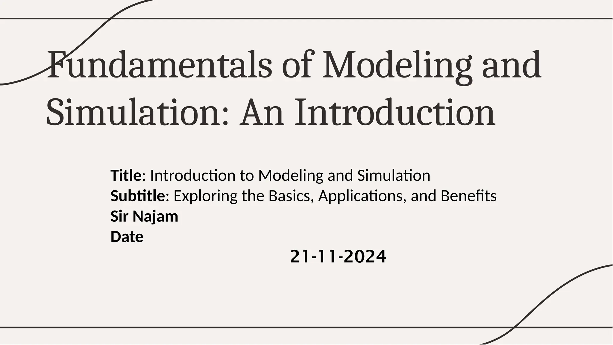 The document provides an introduction to modeling and simulation (M&S), explaining key concepts, components, and applications across various industries such as engineering, healthcare, and business. It highlights the benefits of M&S, including cost-effectiveness and improved decision-making, while also addressing challenges like data dependency and interpretation complexities. The conclusion emphasizes the importance of M&S and its promising future with advancements in technology like AI and big data.