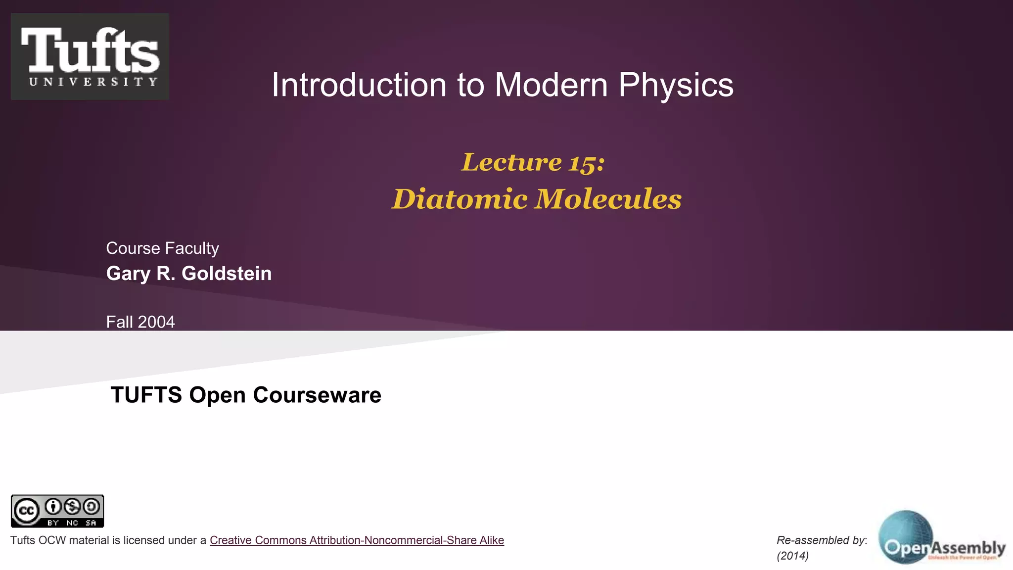This 3 sentence summary provides the essential information about the document: The document is a lecture about diatomic molecules from an introduction to modern physics course taught in the fall of 2004 by Gary R. Goldstein at Tufts University, as it is part of their open courseware program which makes course materials freely available under a Creative Commons license.