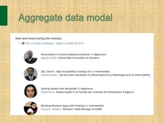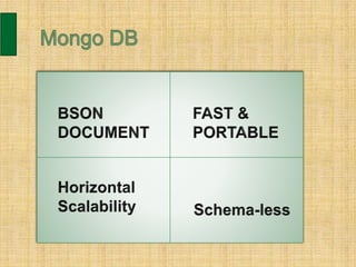 The document discusses various aspects of MongoDB and NoSQL databases, including their architectures and features. It includes information about MongoDB's documentation, a NoSQL meeting with scheduled speakers, and best practices for using the database. Additionally, it covers topics like BSON object IDs, indexed fields, and the use of map-reduce functions for data analysis.