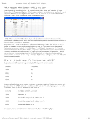 Monte Carlo simulation allows businesses to model uncertain situations by simulating random outcomes thousands of times on a computer. It can be used to estimate probabilities, determine optimal decisions under risk, and evaluate investments. The document describes how to simulate random variables in Excel using functions like RAND(), VLOOKUP(), and NORMINV(). It provides an example of a greeting card company using Monte Carlo simulation over 1,000 iterations to determine the production quantity with the highest expected profit under variable demand.