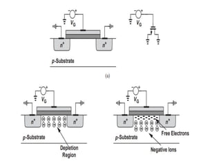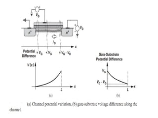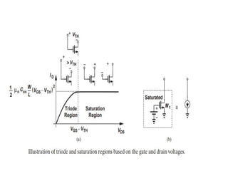 The document discusses the structure and operation of MOS transistors, detailing their I-V characteristics in both the triode and saturation regions. It covers key concepts including threshold voltage, drain current calculations, and the functioning of NMOS and PMOS transistors. The summary includes the behavior of these devices under various voltage conditions and their representation as switches.