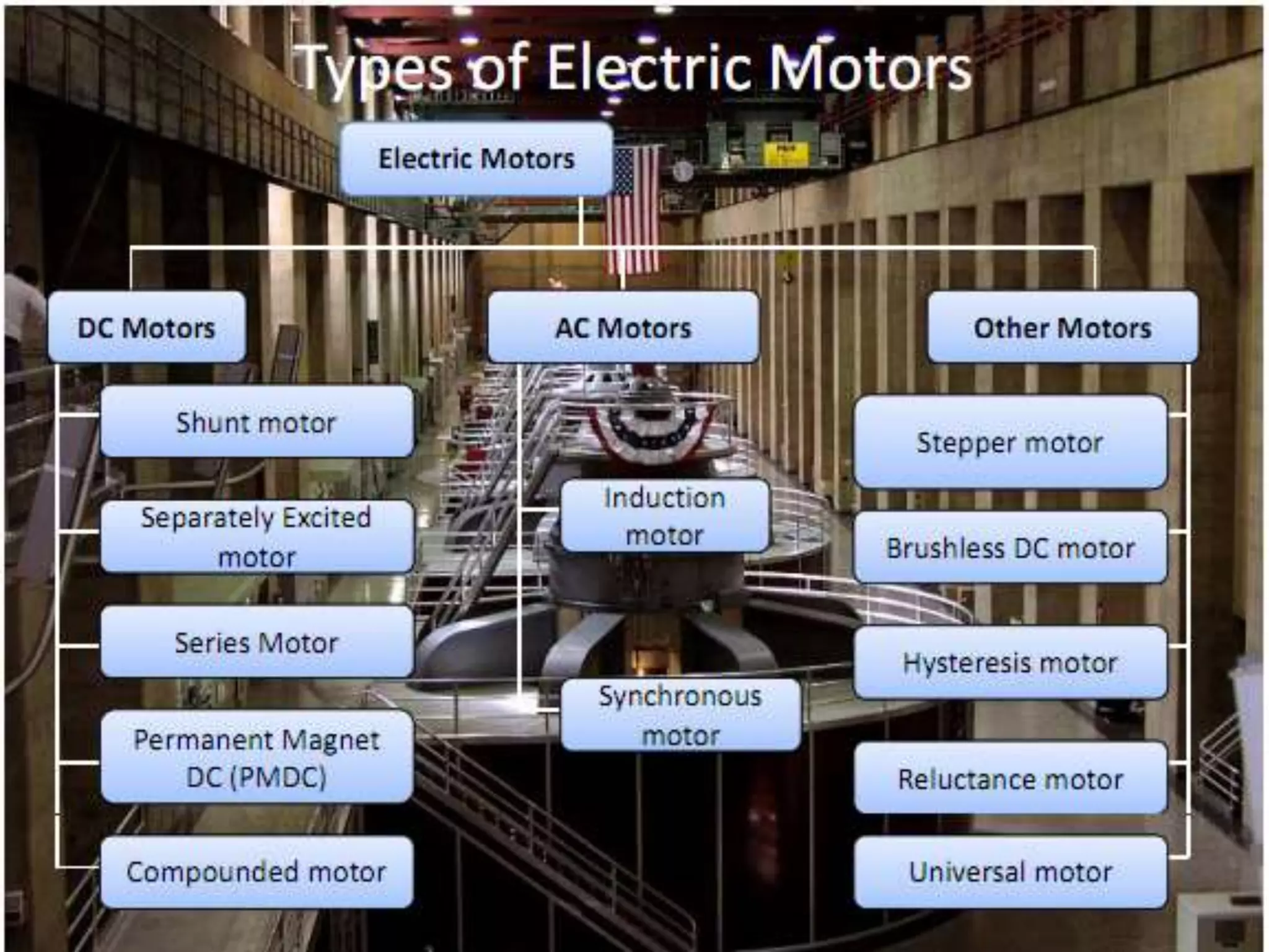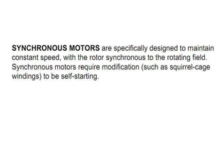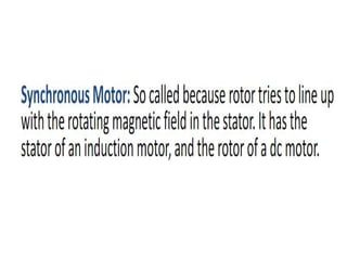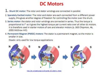 This document discusses different types of electric motors. It describes the basic components of a DC motor including the rotor, stator, and air gap. It then discusses advantages of series and permanent magnet DC motors. Permanent magnet DC motors have higher efficiency and power density. Synchronous motors require supplemental mechanisms to start but provide precise speed control. Induction motors are the most common type due to their simple and rugged design, and can operate at constant speed from no load to full load. However, variable speed control requires a variable frequency drive.