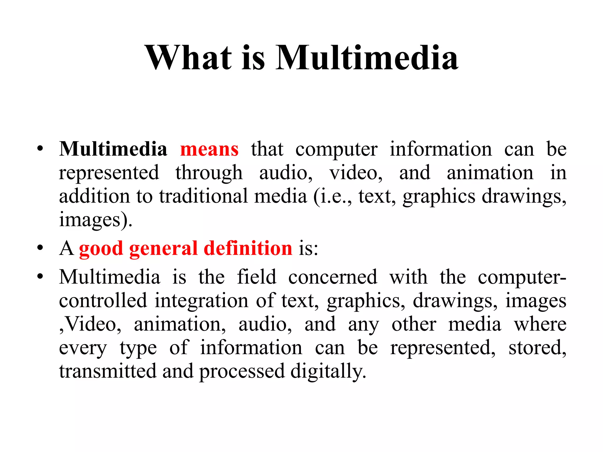 Multimedia involves integrating different types of digital media like text, graphics, images, audio and video. A multimedia system processes multimedia data using a computer and digitally represents all information. It has an interactive interface and integrated components. Multimedia applications include interpersonal communication using video calls, interactive websites, and entertainment like video on demand.