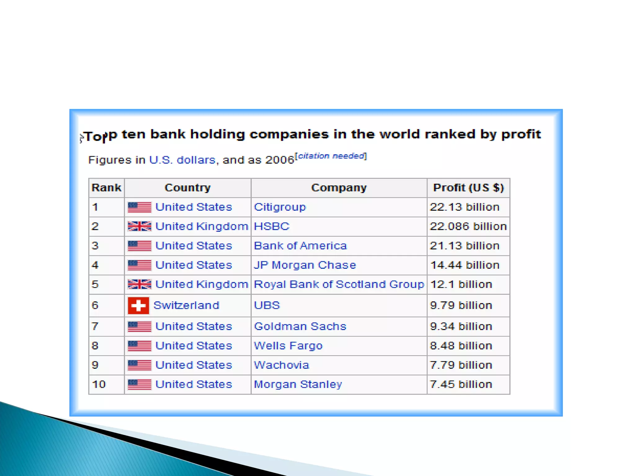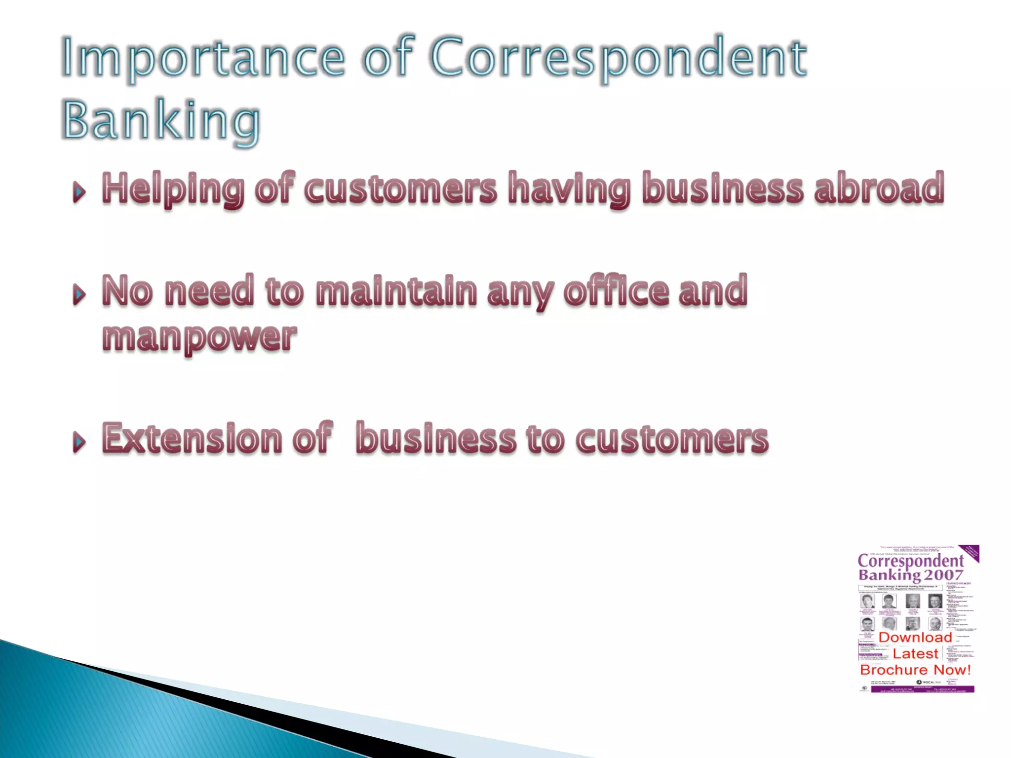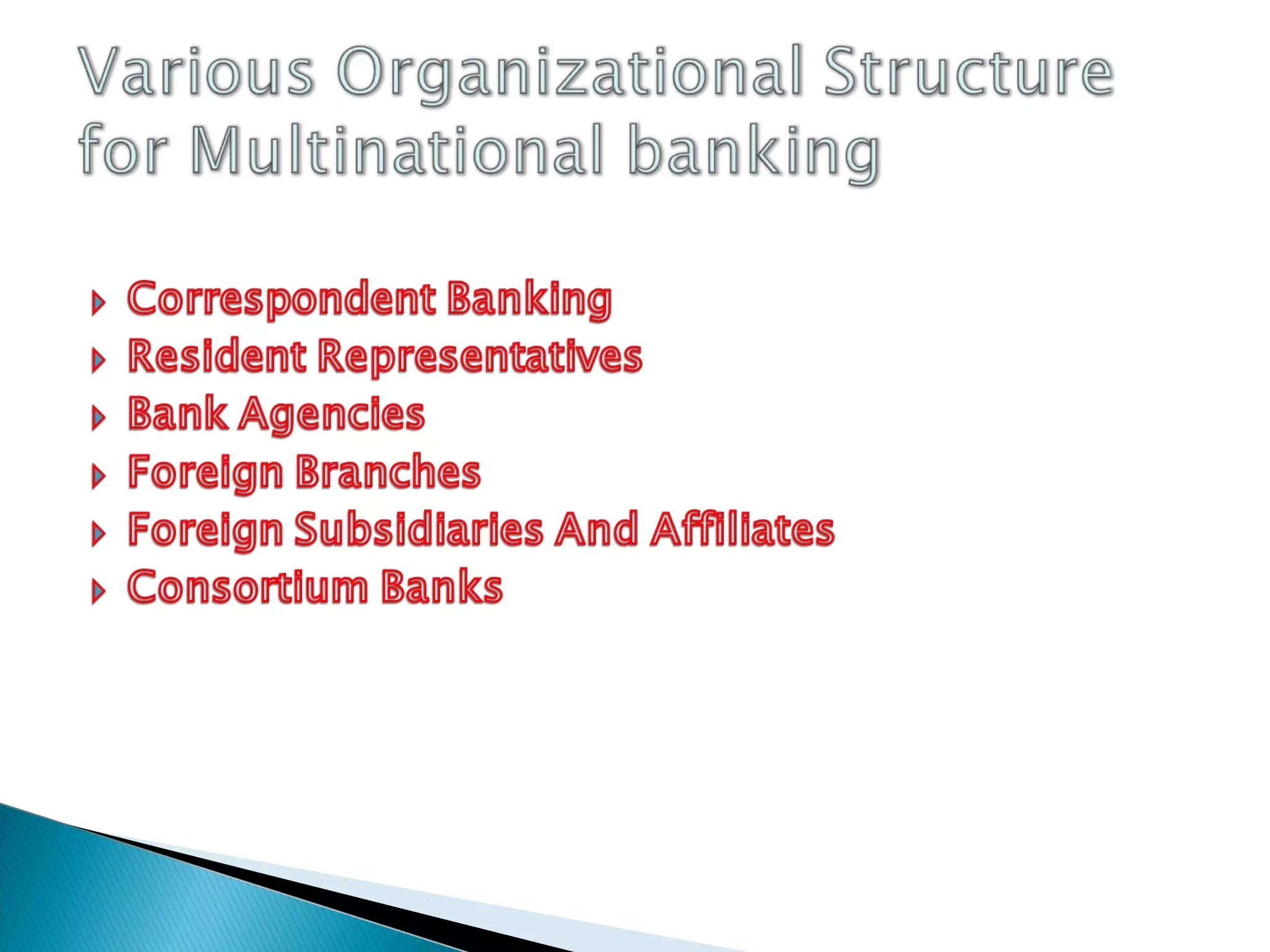 A bank is an organization chartered by the government to receive deposits, make loans, and offer related financial services. Multinational banks physically operate in more than one country, while international banks engage in cross-border operations without local offices. The top ten banking groups are ranked by shareholder equity. Regulatory changes, technology, financial innovation, and economies of scale impact banks' organizational structures and operations.