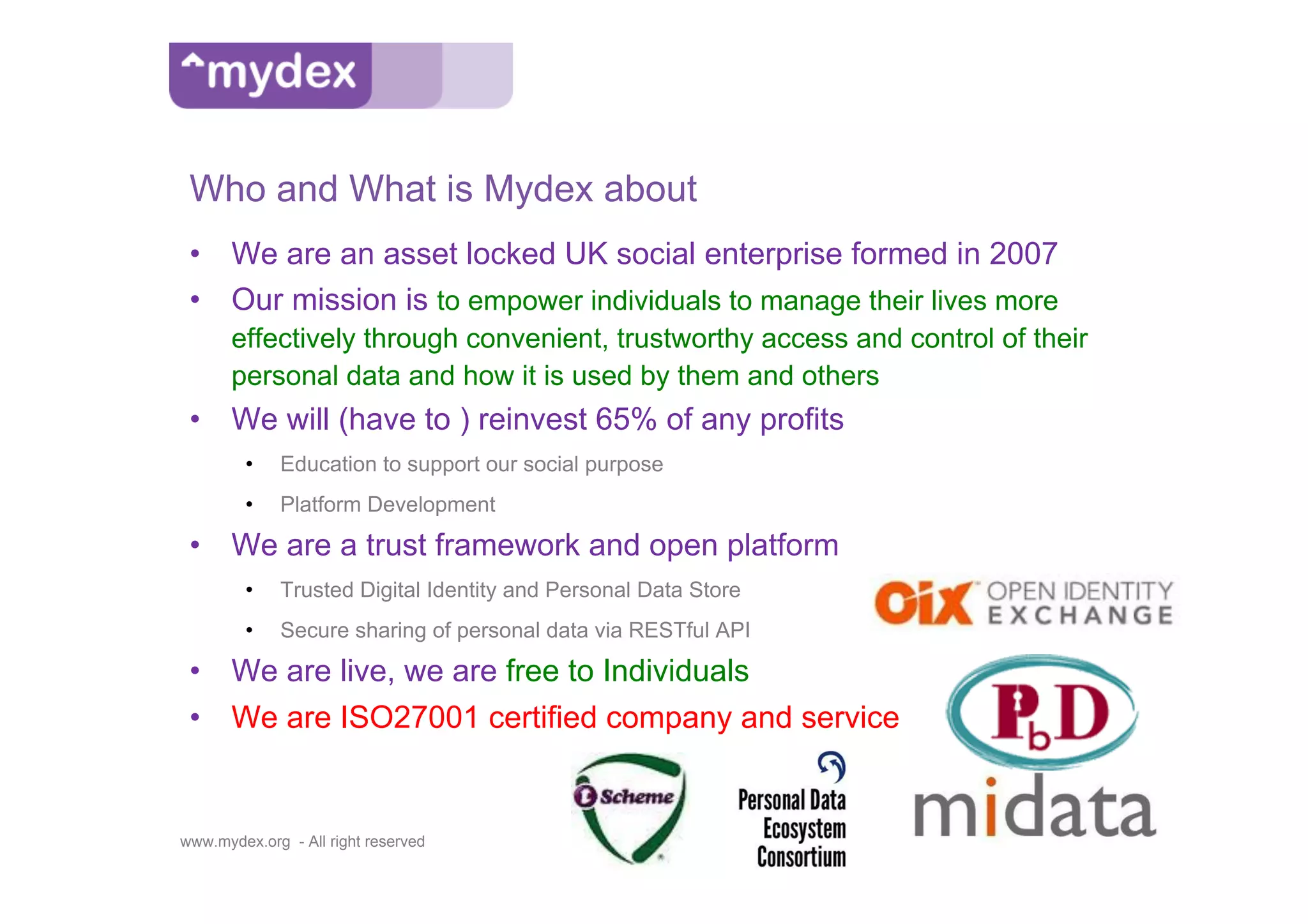 Mydex is a UK social enterprise established in 2007, focused on empowering individuals to manage their personal data securely while providing services to organizations and application developers. The platform offers a trusted identity framework, enabling streamlined customer engagement and effective data management through a personal data store, addressing challenges such as fraud prevention and data fragmentation. Mydex's commercial model is designed for sustainability, providing free services to individuals and low-cost connections for organizations, while ensuring data privacy and user control.